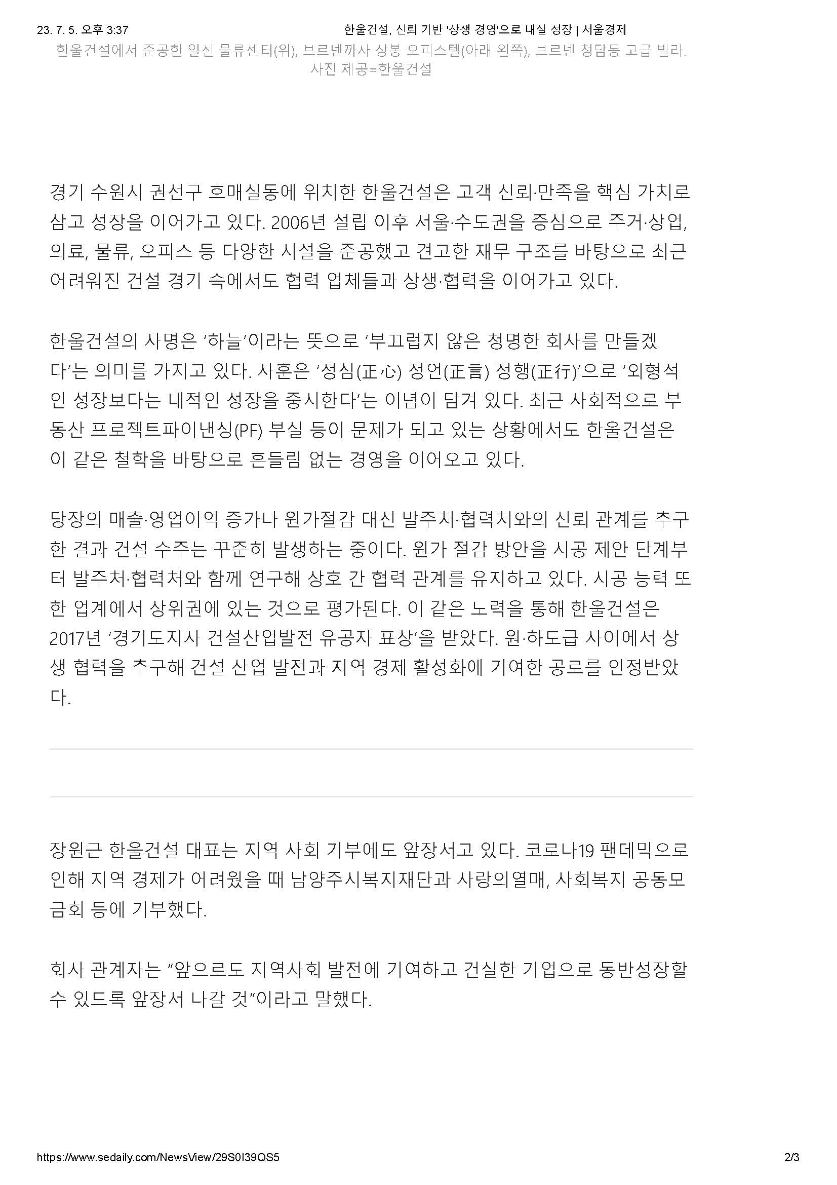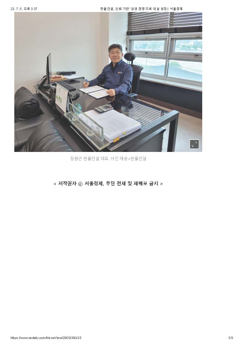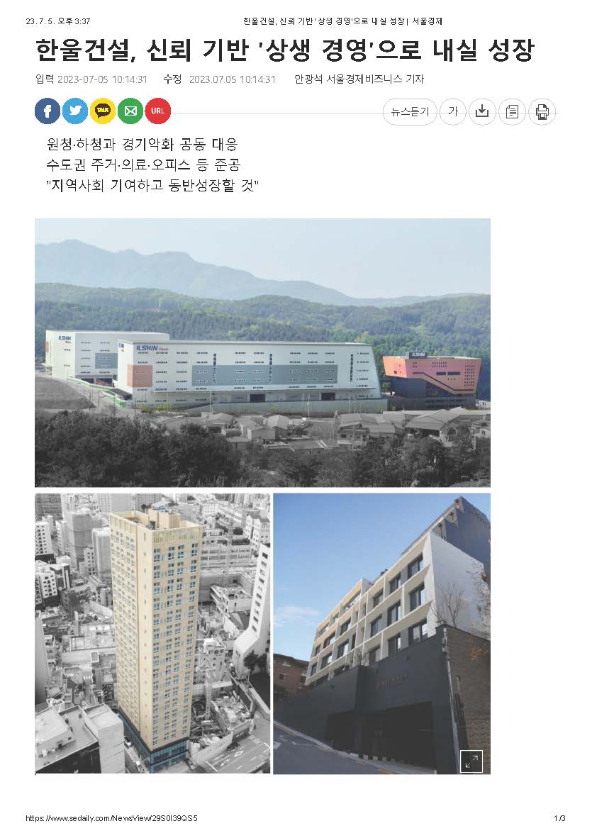 서울경제신문이 주최하고 벤처기업협회, 백상경제연구원, SEN서울경제TV 가 후원하는 종합건설부문 [2023 대한민국 올해의 중소기업] 에 당사가 선정되었습니다.
