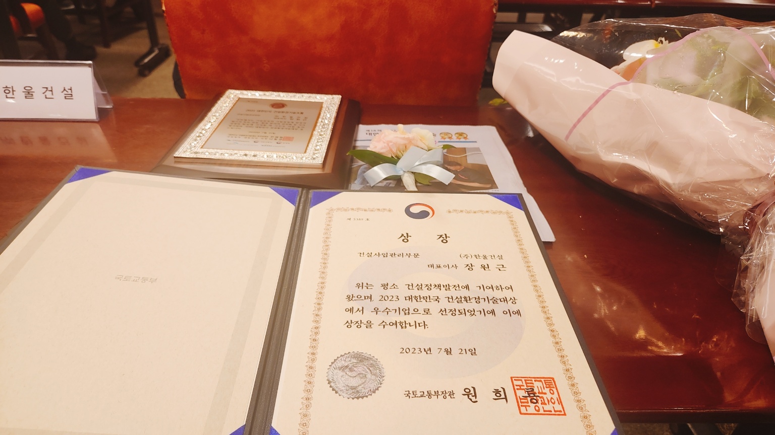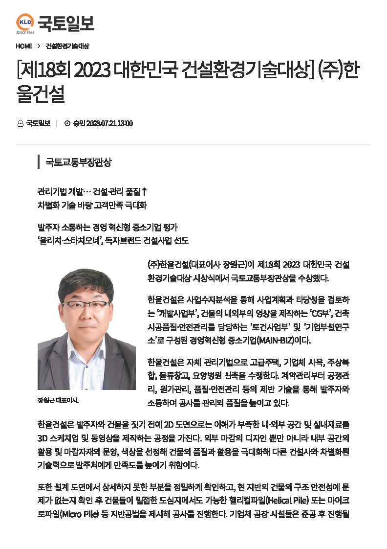 당사는 2023년 7월 21일 강남구 논현동 건설회관에서 열린 제18회 2023 대한민국 건설환경기술대상 시상식에서