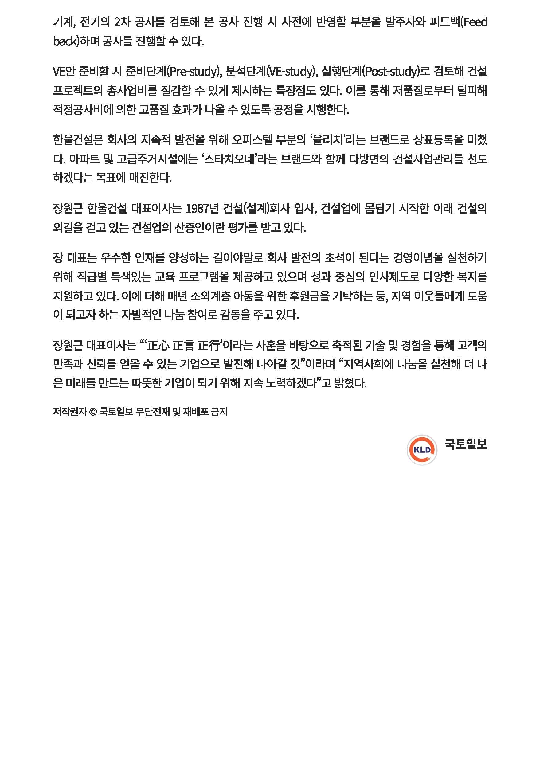 (주)한울건설은 앞으로도 모든 구성원들이 자부심을 가질 수 있는 당당하고 강한 기업으로 나아가겠습니다.